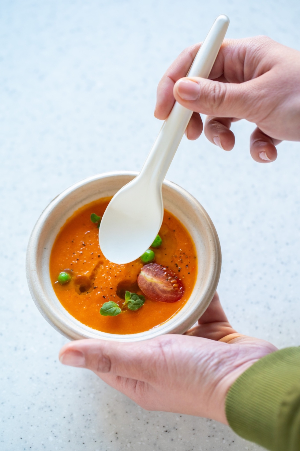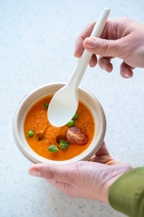 Der Suppenlöffel aus Papier weist eine Tiefe auf, die auf dem Markt einzigartig ist. Das neue, patentierte und vollständig recycelbare Papierbesteck von Sabert vereint Nachhaltigkeit und herausragende Leistungen in Bezug auf Stabilität und Schneidefähigkeit. Elegant und robust, haben sie die perfekte Länge für ein einfaches Handling und eine angenehme, glatte Haptik. Hervorragende Funktionalität sowohl bei heißen als auch bei gekühlten Speisen.
