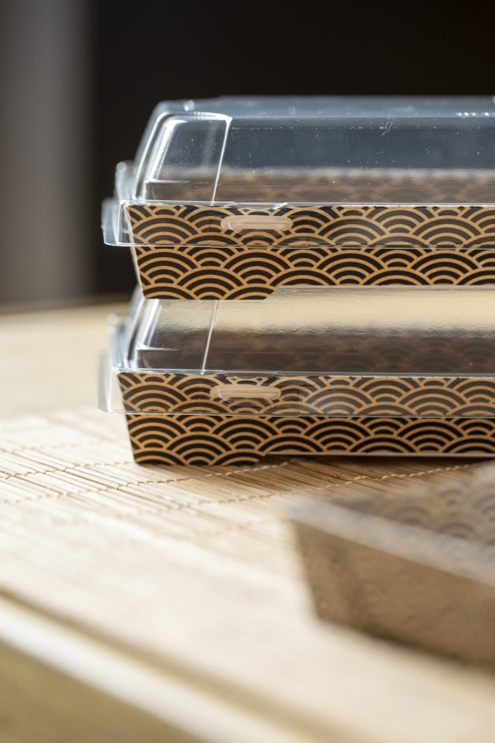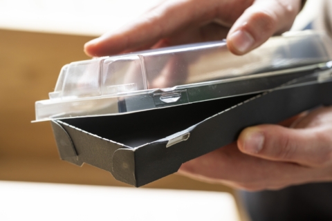 Der beschlagfreie rPET-Deckel für die Pappschalen von Tray2Go ermöglicht eine hervorragende Produktsichtbarkeit. Der innovative und patentierte, fest sitzende, äußerst transparente Click-Lock-Deckel rastet sicher ein und bietet einen hervorragenden Produktschutz für Lebensmittel unterwegs und bei der Auslieferung und ermöglicht einen Einhandverschluss für eine effizientere Vorbereitung im Herstellungsprozess. Der rPET-Deckel ist aus mindestens 50 % recycelten Materialien hergestellt.