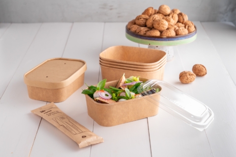Disponible en 4 tailles différentes avec un couvercle soit en rPET transparent, soit en PP micro-ondable ou encore en papier kraft.