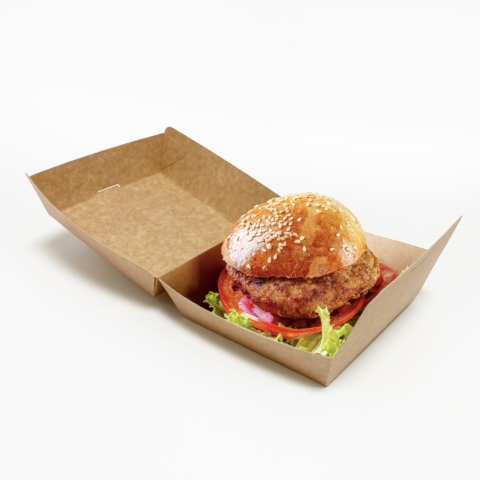 La boite burger avec couvercle est votre meilleur allié d'emballage fast food et garde vos burgers en sécurité durant le transport. Notre ingénieux rabat frontal avec système de verrouillage assure la protection des aliments lors de l'ouverture de la boîte et apporte une rigidité supplémentaire lors de l'empilage. Notre gamme d'emballages en carton est naturellement résistante aux graisses et personnalisable (impression et taille).
