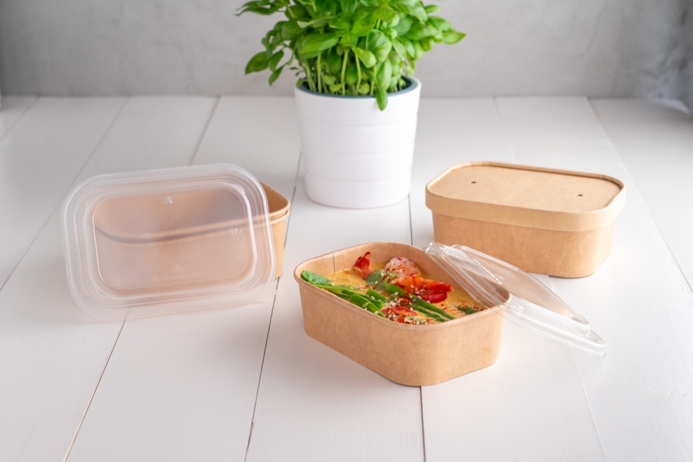 Couvercle en papier carton pour barquette rectangulaire 500, 650, 750 & 1000ml pour une solution de livraison 100% en carton. Le couvercle est doublé en PP et est donc approprié pour les usages chauds et le microonde.
