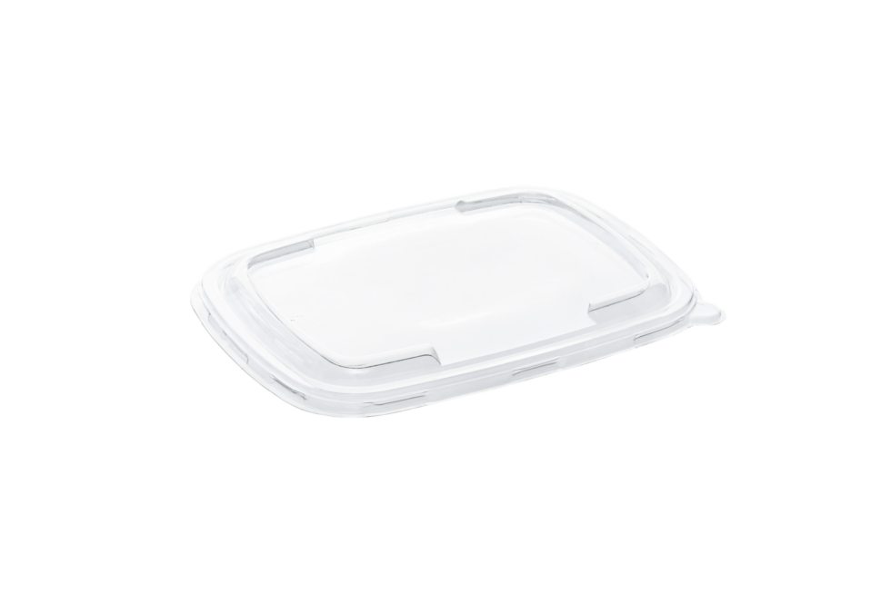 Couvercle en rPET transparent pour barquette rectangulaire laminée 21x16cm. Choisissez nos couvercles antibuée en PET recyclé post-consommation qui garantissent que vos aliments restent visibles à tout moment. Le couvercle en rPET vous assure une visibilité du produit maximale et est composé d'un minimum de 50% de matériaux recyclés.