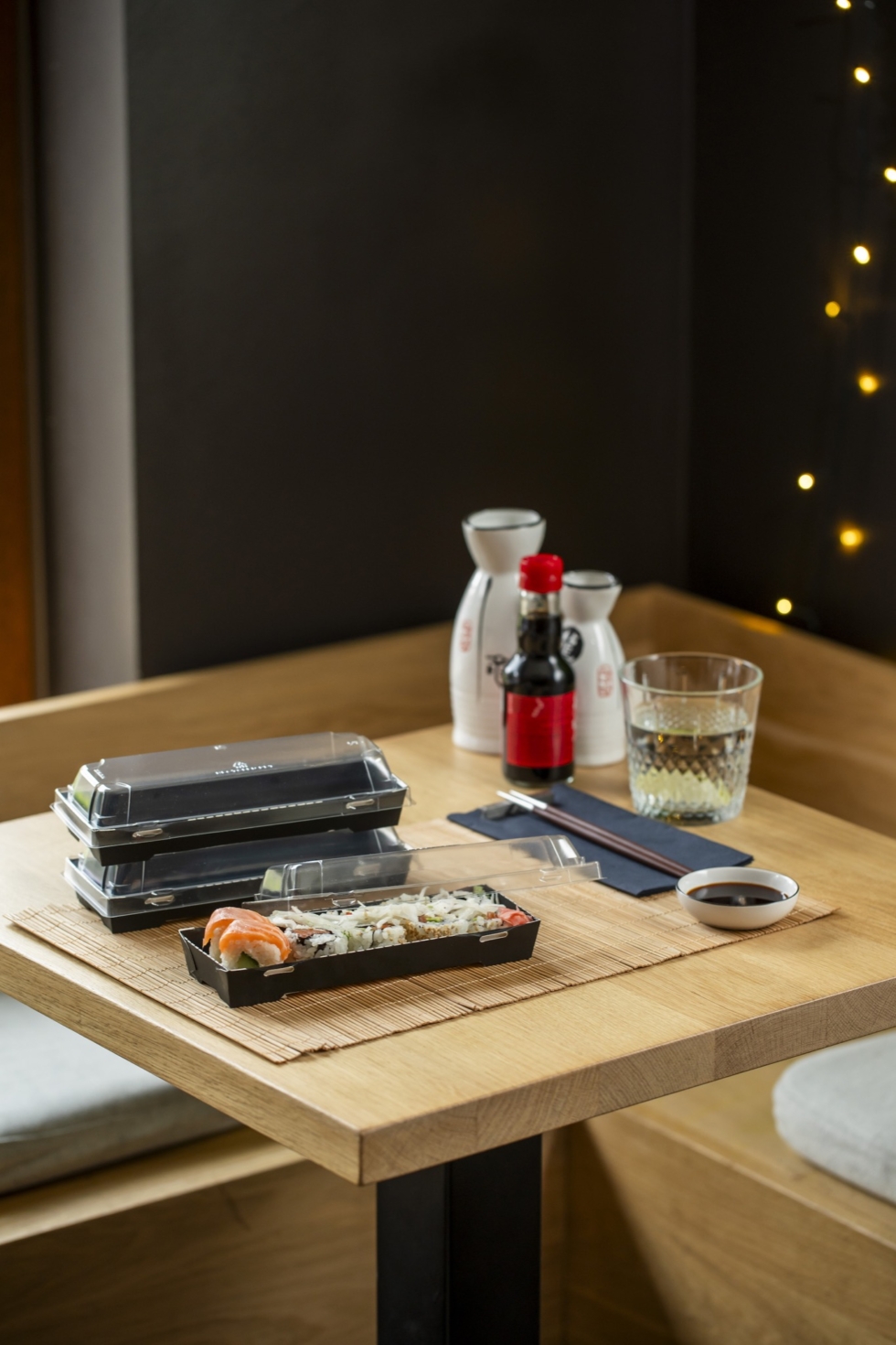 Notre nouvelle barquette en carton, à utiliser comme boite à sushis ou comme plateau avec couvercle pour tous plats réfrigérés à emporter, les pâtisseries et produits de boulangerie. Pratique à utiliser, notre gamme multifonctionnelle et polyvalente Tray2Go est dotée d’un plateau à double paroi robuste conçu pour un emboîtement efficace et un empilage sécurisé tout en conservant une excellente visibilité des produits. Le couvercle à fermeture unique et innovante se clipse et se verrouille fermement offrant une protection optimale aux aliments à déguster sur le pouce ou pour livraison. Sa fermeture rapide permet également d’optimiser l’efficacité lors de la préparation et du processus de fabrication.