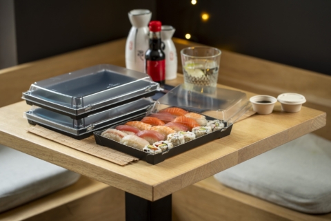 Our new sustainable cardboard tray, your new sushi tray or the platter tray for any chilled food-to-go including confectionery and bakery products. Practical to use, our multifunctional and versatile cardboard tray Tray2Go range features a robust doublewall tray and an anti-fog rPET lid, perfectly nestable and designed for secure stacking, while retaining excellent product visibility. The innovative and patented secure fitting high-clarity click-lock lid locks securely in place, offering great product protection for food-on-the-go and delivery, and enables one-hand closure for more efficient preparation in the manufacturing process.