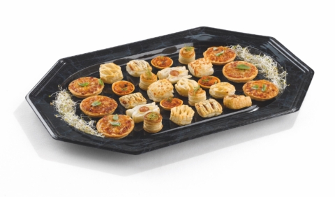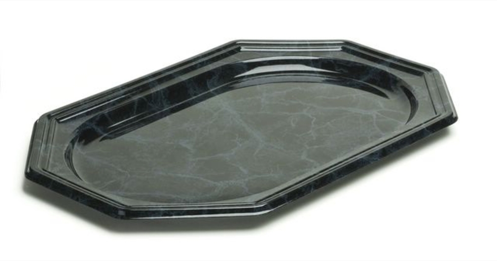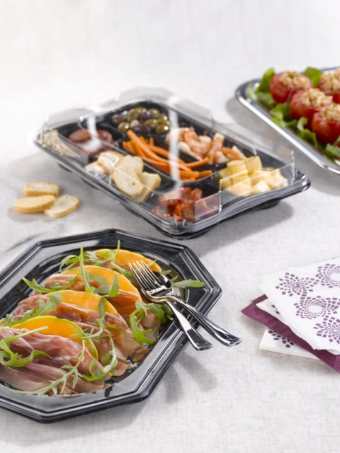 Sabert offers the largest assortment of recycled and recyclable PET platters trays and lids, with a very large choice of design, colours and dimensions. Thanks to an exclusive lamination process, Sabert black, marble, but also silver Platters offer outstanding renders with perfect illusion of stainless steel and reusable catering platters and become the best sandwich trays with lids option!