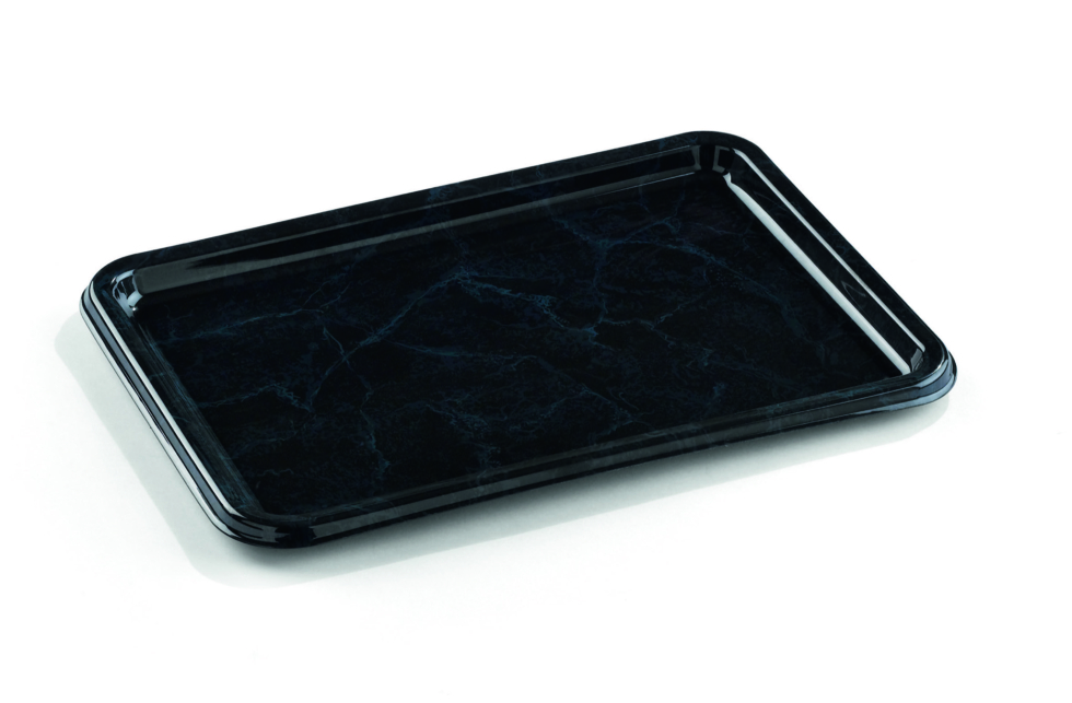 Sabert offers the largest assortment of recycled and recyclable PET platters trays and lids, with a very large choice of design, colours and dimensions. Thanks to an exclusive lamination process, Sabert black, marble, but also silver Platters offer outstanding renders with perfect illusion of stainless steel and reusable catering platters and become the best sandwich trays with lids option!