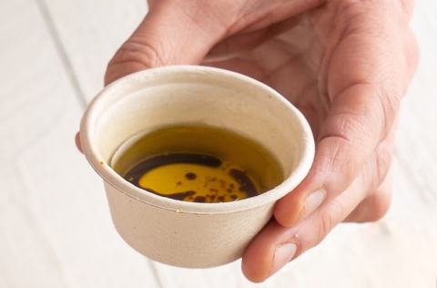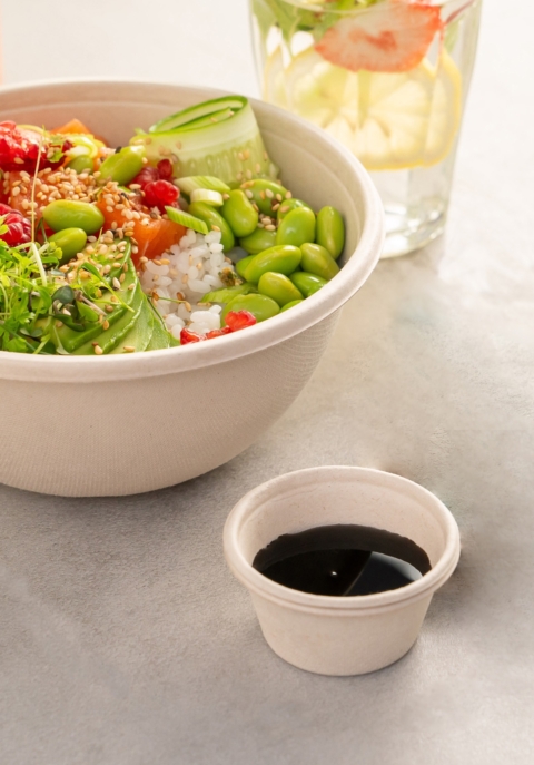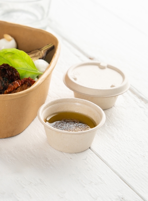 BePulp sauce pot available with its cup lid, the container is home compostable, recyclable and made from natural fibres of plant origin without intentionnaly added PFAS.